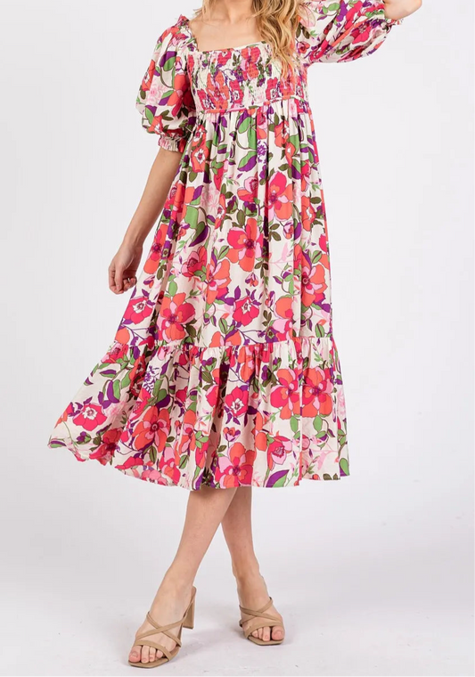 Ellie Flower Print Puff Sleeve Ruffle Smocked Midi Dress