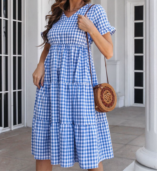 Elizabeth Plaid V-Neck Short Sleeve Midi Dress